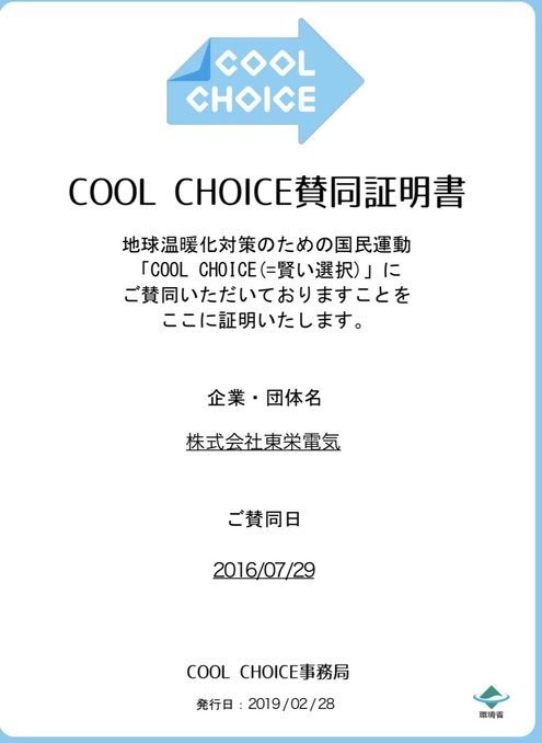 2019/02/28 CoolChoice賛同証明書 弊社では、環境省の提唱するCoolChoice(クールチョイス)賛同書を取得しております。 環境省の温暖化対策、地球に住む人間として、低炭素社会実現の為のLED照明の普及や高効率エアコンや家電の提案、次世代の暮らし方の提案等、弊社の取組みが認められました。 tagPlaceholderカテゴリ: